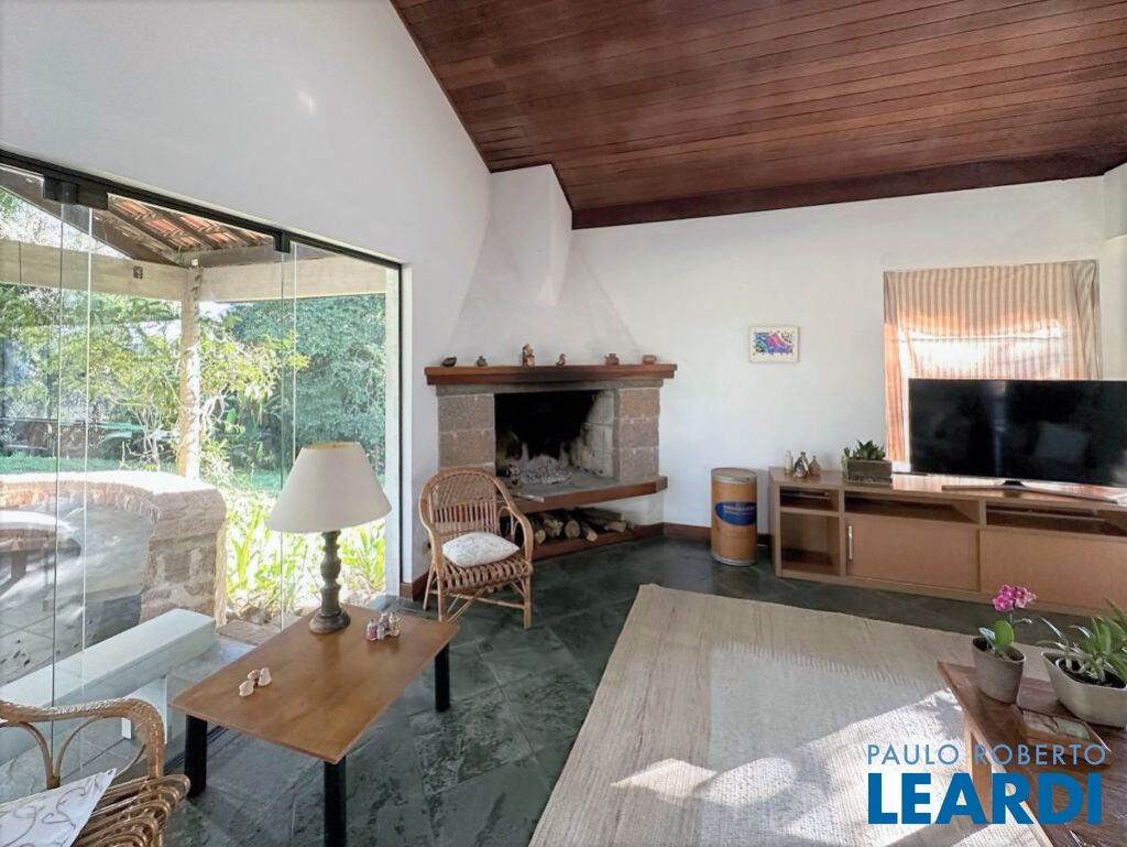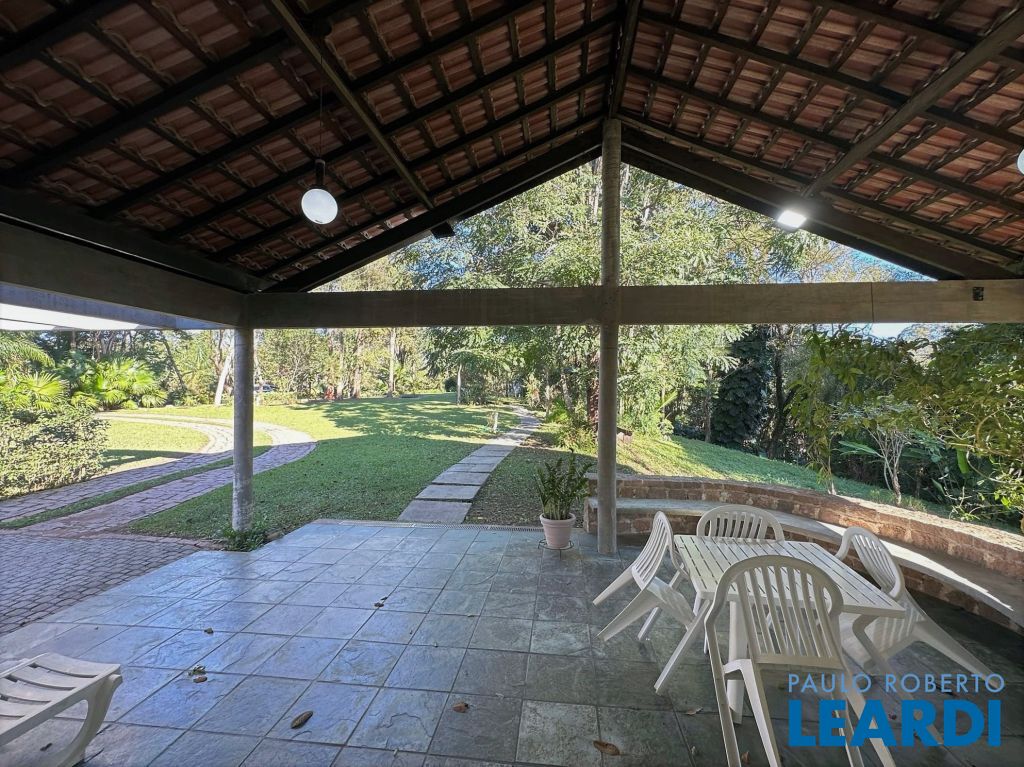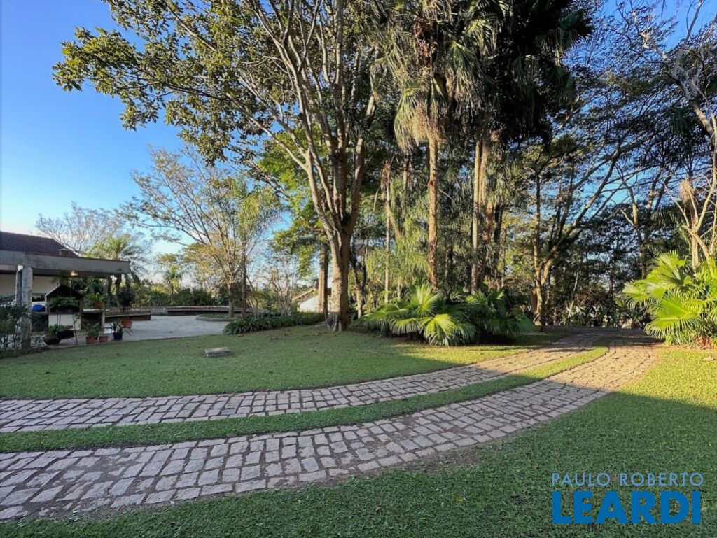 ÓTIMA OPORTUNIDADE PARA MORAR OU INCORPORAR! Ideal para quem busca muita natureza, tranquilidade e privacidade em ótima localização. Linda propriedade na Fazendinha - Granja Viana. Terreno maravilhoso 10.490 m² quase plano, levemente ondulado. Bosque belíssimo com trilhas e pátios. Jardim com paisagismo formado por mata nativa, um grande gramado e frutíferas: caqui, mexerica, limão, manga, jaca, abacate, kinkan e grapefruit. Pisos em ardósia, tacos de madeira e cerâmica. Abastecimento de água: Sabesp. Armazenamento: 11.000 litros. Casa Sede contemporânea com anexos complementares: Gourmet, Hóspede, Cocheira, Ateliê e Caseiro. CASA SEDE - 346 m² TÉRREA COM ACESSIBILIDADE TOTAL. Pé direito alto, envidraçada bem arejada e iluminada. Hall de entrada social. Lavabo com tampo de mármore. Living para 4 ambientes voltados para varanda: Estar, lareira, jantar e bar. Varanda com bancos, voltada para o lazer com jardim e pérgula com churrasqueira, bancada e pia. Escritório envidraçado com estantes e ar condicionado. Sala de almoço integrada à cozinha. Sala de TV. Hall íntimo com roupeiro. 3 dormitórios, sendo 1 suíte com closet e varanda, 2 dormitórios com excelentes armários embutidos. Banheiros com tampos em mármore, espelhos, gabinetes e box de vidro, sendo a máster com bidê e hidro. Copa cozinha americana planejada repleta de armários. Escada interna para área de serviço e garagem, com acesso externo por rampa também. Caixa perdida (porão). Área de serviço aberta ensolarada e lavanderia fechada com 2 tanques e dependências de empregada (suíte). Portão automático. Garagem com 2 vagas cobertas e acesso interno. Mais enorme pátio e jardim para muitas vagas. Canil. Depósito. Aquecimento: Solar com suporte elétrico ANEXO HÓSPEDES - 50m² Varanda / terraço. Sala / quarto. Banheiro com chuve
