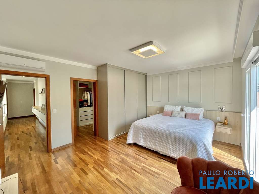 Linda casa contemporânea / moderna, com ótimo acabamento. Envidraçada, ensolarada, bem arejada e iluminada. Imóvel repleto de planejados decorativos refinados, de qualidade e bom gosto. Portas e janelas externas em PVC e vidro, com persianas elétricas nos quartos. Pisos em porcelanato, taco de madeira e Fulget. Projeto de gesso e iluminação. Louças e metais Deca de qualidade. Jardim com paisagismo. 2 acessos: social e serviço / lazer. Hall de entrada social por um porta pivotante imponente. Lavabo com tampo em mármore, espelho e gabinete. Escritório / sala de TV com ar condicionado Q e F. Escada de alvenaria, revestida em Travertino, com guarda corpo de metal. Hall íntimo no piso superior. Grande aparador com 6 gavetas e roupeiro. 4 suítes com ar condicionado Q e F e persianas elétricas. 3 com armários e 2 com terraços. A master com closet. Banheiros com espelho, tampos em Travertino, gabinetes e box de vidro, sendo a master com espelho grande, 2 cubas, 2 duchas e box de vidro até o teto. Living para 4 ambientes voltados para o lazer. Com anexo gourmet, quintal, piscina e jardim. Estar, lareira, jantar, bar. Anexo gourmet com churrasqueira, bancada em granito, 2 cubas inox. Vestiário com box de vidro e lavatório externo. Piscina de alvenaria adulto e infantil revestida em vinil, com piso antiderrapante, solarium e casa de máquinas. Copa cozinha com porta de correr, repleta de armários planejados, banca de granito em “L”, 2 cubas inox e despensa. Área de serviço aberta ensolarada e lavanderia fechada com tanque e armários. Suíte de serviço para empregada, revertida em despensa com banheiro. Garagem para 4 vagas, sendo 2 cobertas com depósito. Aquecimento central de água: Boiler (2 x 400 litros) - Solar com suporte elétrico. Abastecimento de água: Sabesp. Armazenamento de água: 3 mil litros