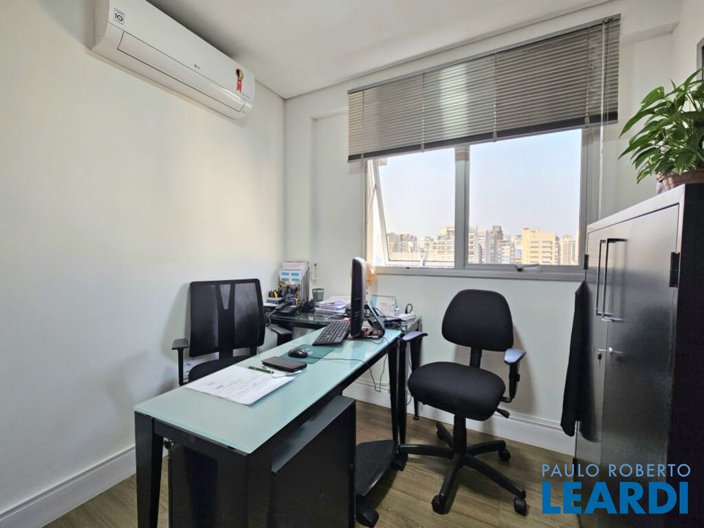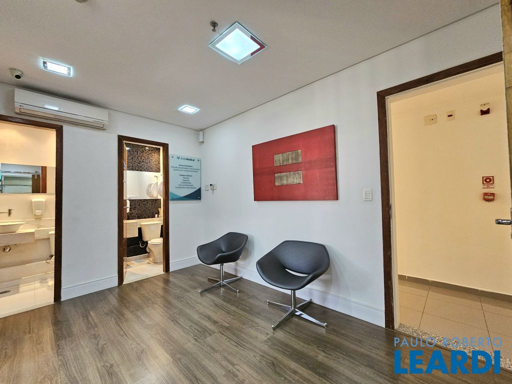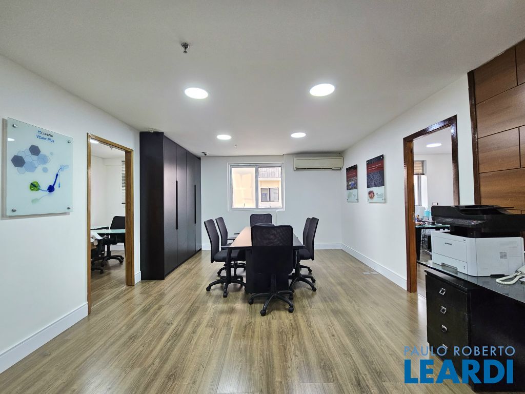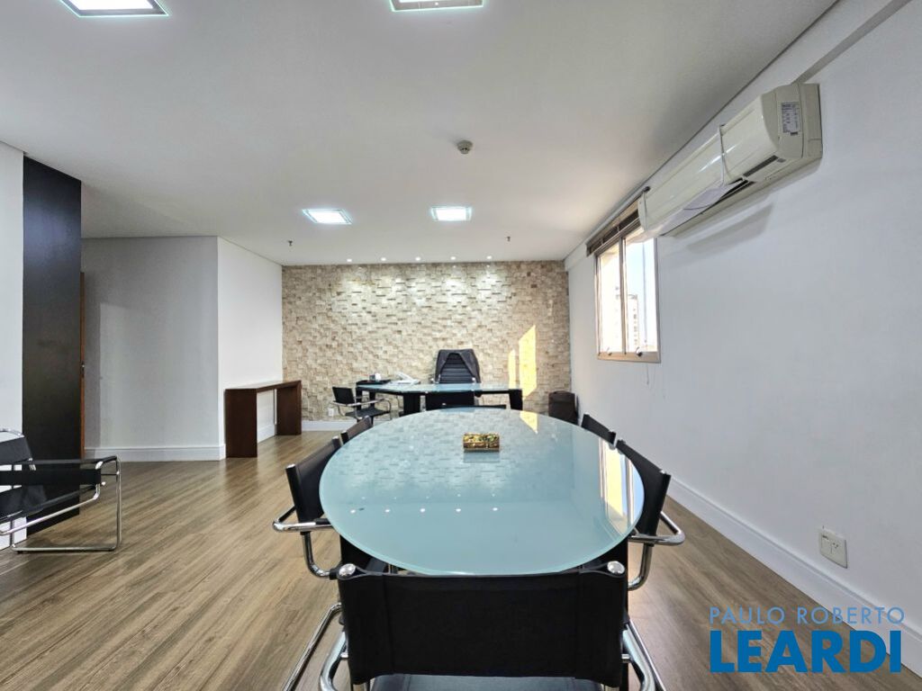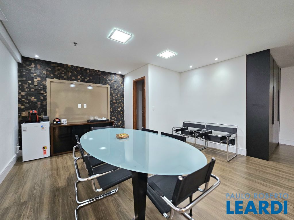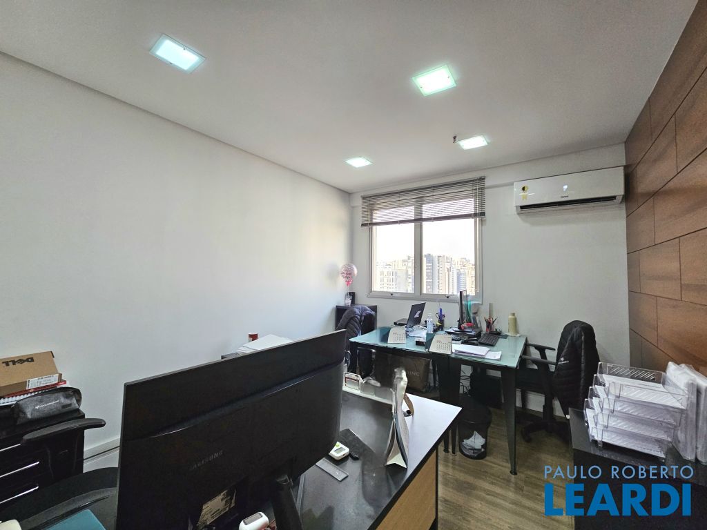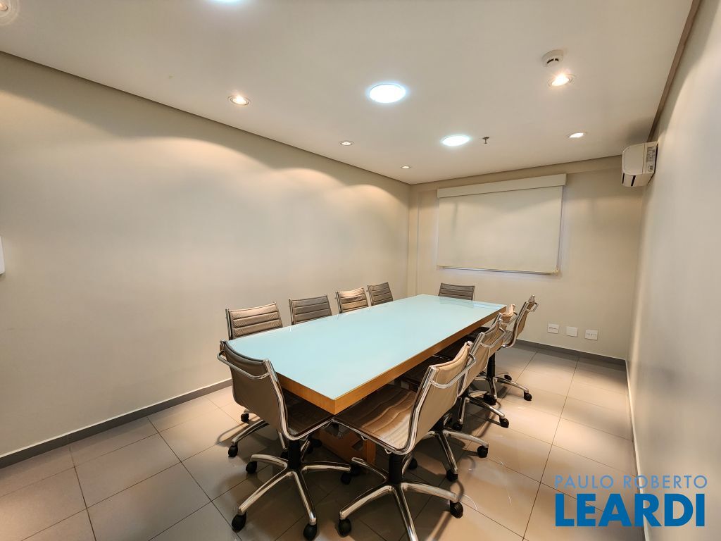 O conjunto é a junção de 4 salas e possui 4 vagas com serviço de manobrista. A configuração atual inclui uma sala de recepção com 2 banheiros (masculino e feminino), além de uma copa com ar-condicionado e cozinha com janelas grandes, que proporcionam ótima iluminação e ventilação. No espaço foram feitas 5 salas independentes, sendo uma ampla sala de diretoria com espaço suficiente para uma mesa de diretor e banheiro privativo, além de uma sala de reunião exclusiva. Também foi criado um ambiente para reuniões na área de distribuição entre as salas. Ar-condicionado em todas as salas, inclusive na copa. Sala técnica para CPD. Conjunto Comercial à Venda com possibilidade de compra com contrato de locação ou para uso próprio) Este conjunto comercial está localizado em um prédio construído em 2008, a 470 ms do metrô Eucaliptos (Linha 5 - Lilás) e 950 ms do Shopping Ibirapuera, conta com 11 andares e oferece diversas comodidades, incluindo: * Portaria 24 horas * Café e área externa * Estacionamento com Valet para clientes * Sala de reuniões disponível para contratação por período * 3 elevadores.