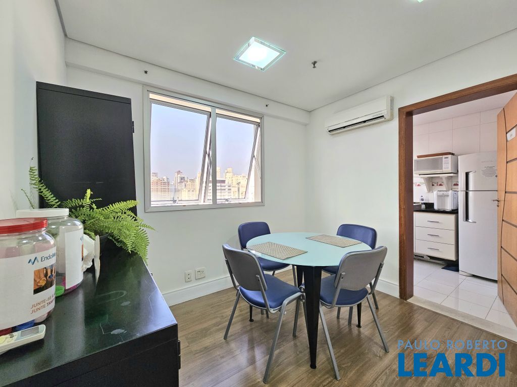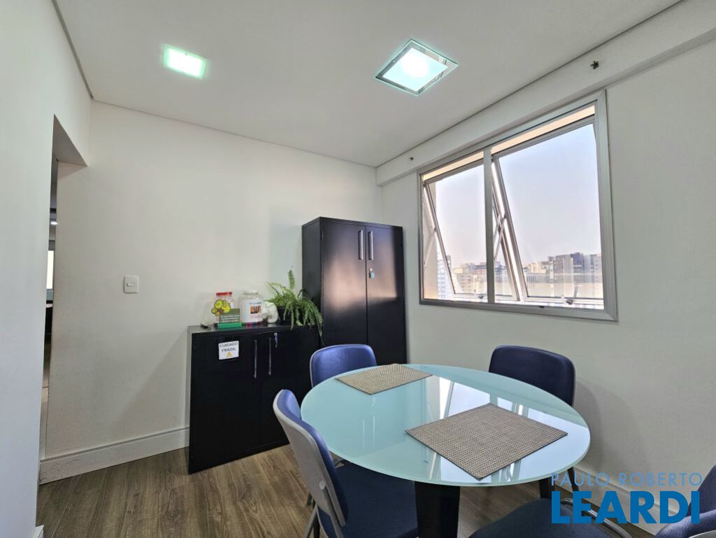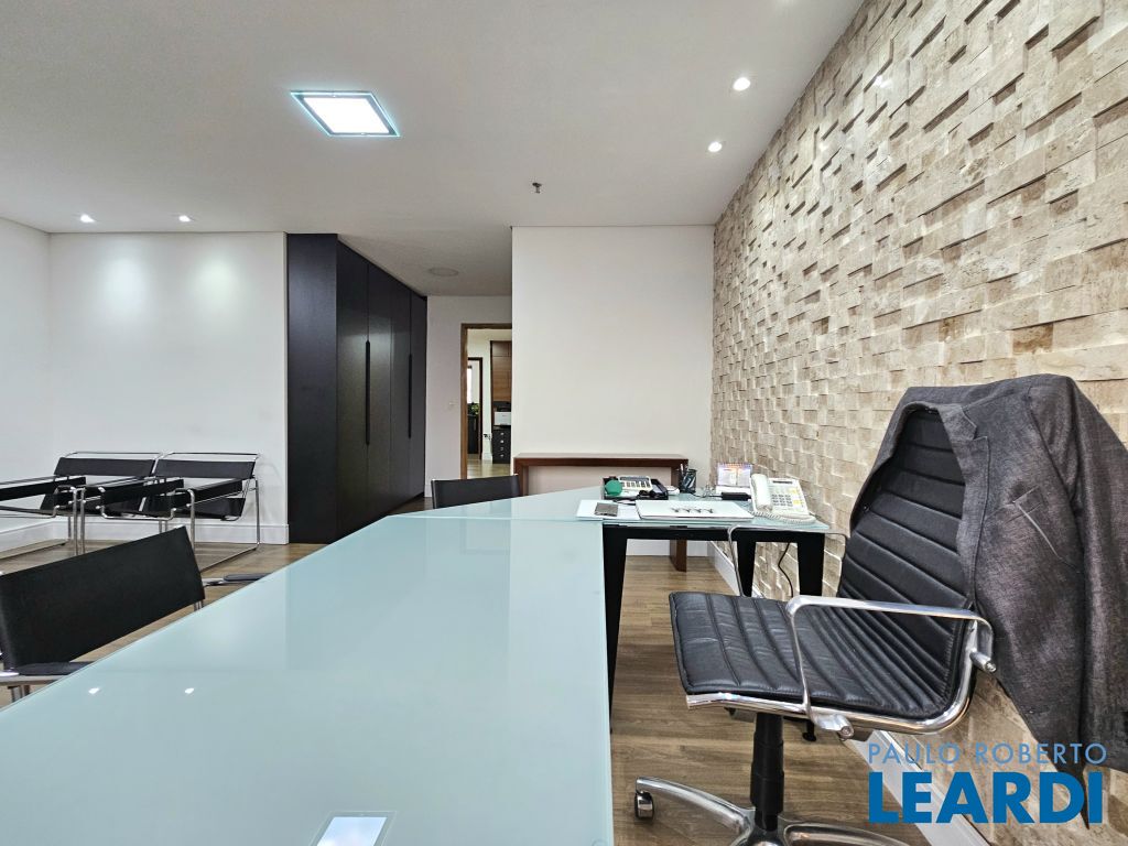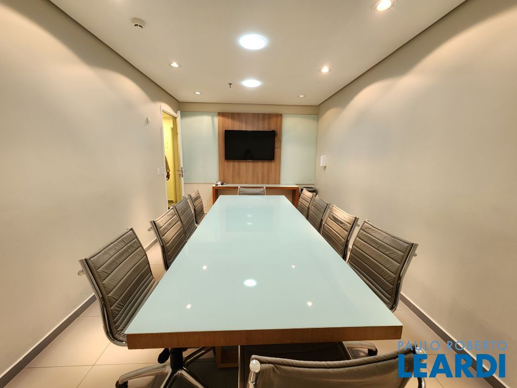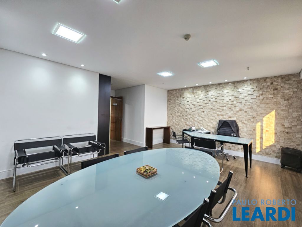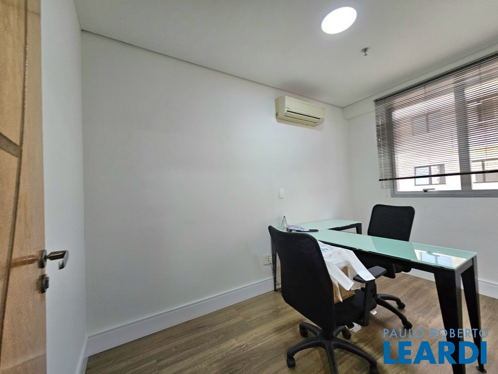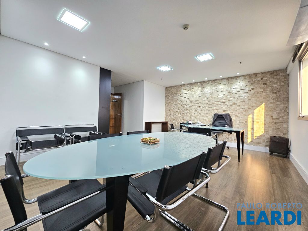 O conjunto é a junção de 4 salas e possui 4 vagas com serviço de manobrista. A configuração atual inclui uma sala de recepção com 2 banheiros (masculino e feminino), além de uma copa com ar-condicionado e cozinha com janelas grandes, que proporcionam ótima iluminação e ventilação. No espaço foram feitas 5 salas independentes, sendo uma ampla sala de diretoria com espaço suficiente para uma mesa de diretor e banheiro privativo, além de uma sala de reunião exclusiva. Também foi criado um ambiente para reuniões na área de distribuição entre as salas. Ar-condicionado em todas as salas, inclusive na copa. Sala técnica para CPD. Conjunto Comercial à Venda com possibilidade de compra com contrato de locação ou para uso próprio) Este conjunto comercial está localizado em um prédio construído em 2008, a 470 ms do metrô Eucaliptos (Linha 5 - Lilás) e 950 ms do Shopping Ibirapuera, conta com 11 andares e oferece diversas comodidades, incluindo: * Portaria 24 horas * Café e área externa * Estacionamento com Valet para clientes * Sala de reuniões disponível para contratação por período * 3 elevadores.