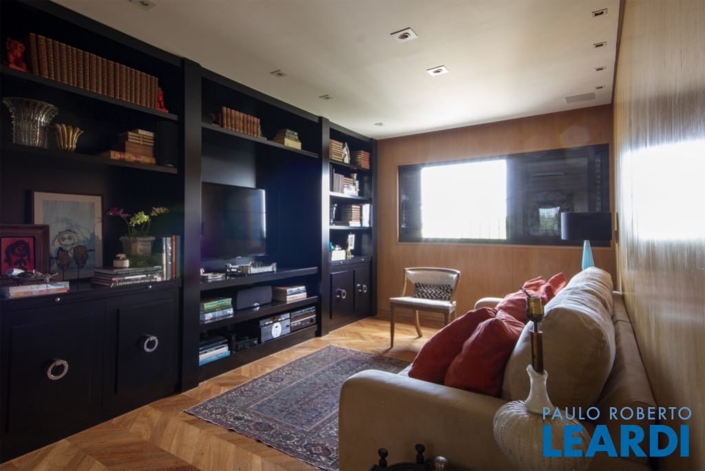 Amplo living com piso em madeira e lareira em mármore Armani, peça única