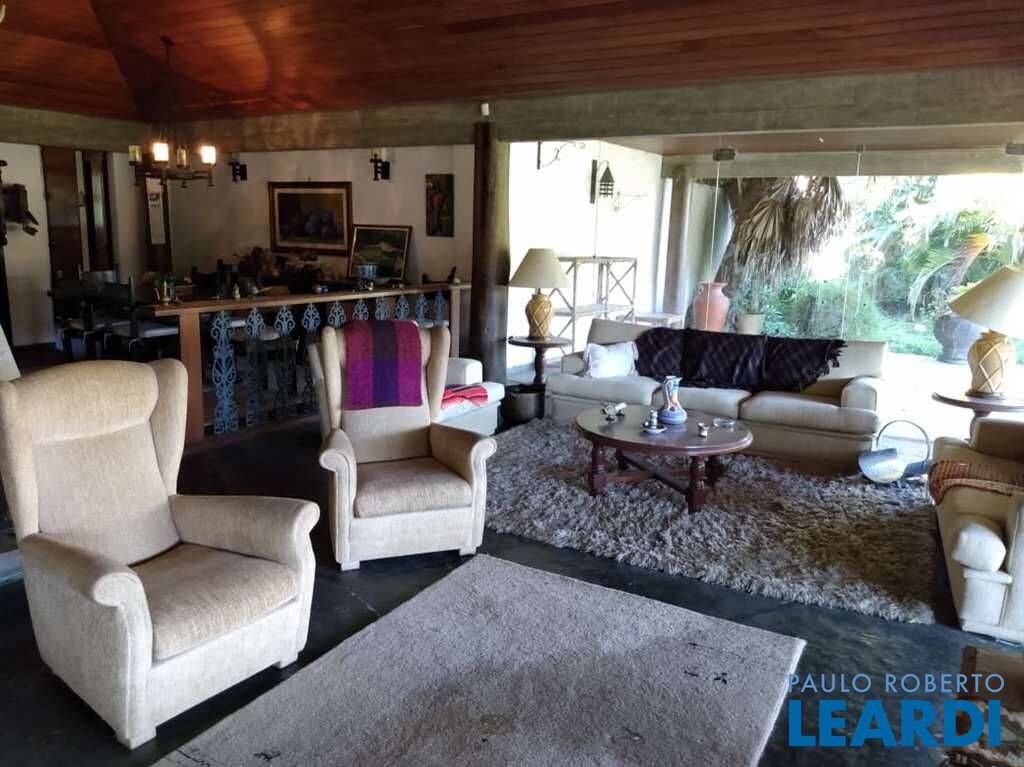 Ótima casa envidraçada e avarandada, voltada para um lindo jardim com muita à natureza. Living para vários ambientes: Estar, lareira, jantar e bar. Grande varanda. 5 dormitórios, sendo 1 suíte. 2 Banheiros. Cozinha com despensa. Área de serviço aberta ensolarada e lavanderia fechada com tanque. Canil com 3 baias. Pátio para muitas vagas de estacionamento. Aquecimento: Chuveiro elétrico em uso. Gás desativado precisando manutenção. Abastecimento de água: Sabesp e 2 poços desativados. Armazenamento: 750 litros (500 litros principal e e 250 litros caseiro). CASA CASEIRO Sala /Cozinha Quarto Banheiro